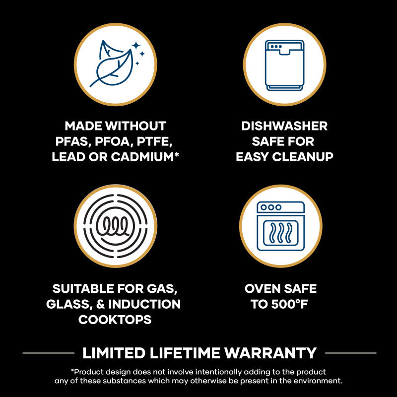 Forged Induction features induction-ready ceramic nonstick, forged aluminum for superior heating, steel bases for enhanced durability, and black exteriors with gold-colored accents that stand out in any kitchen